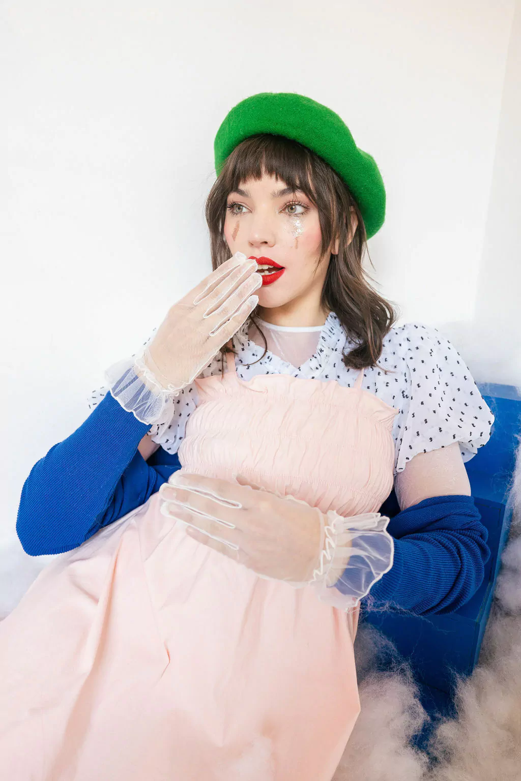 VESTIDO DE COTTON SATEN CON MANGUITAS DE GASA CON PUNTITOS PLUMETÍ