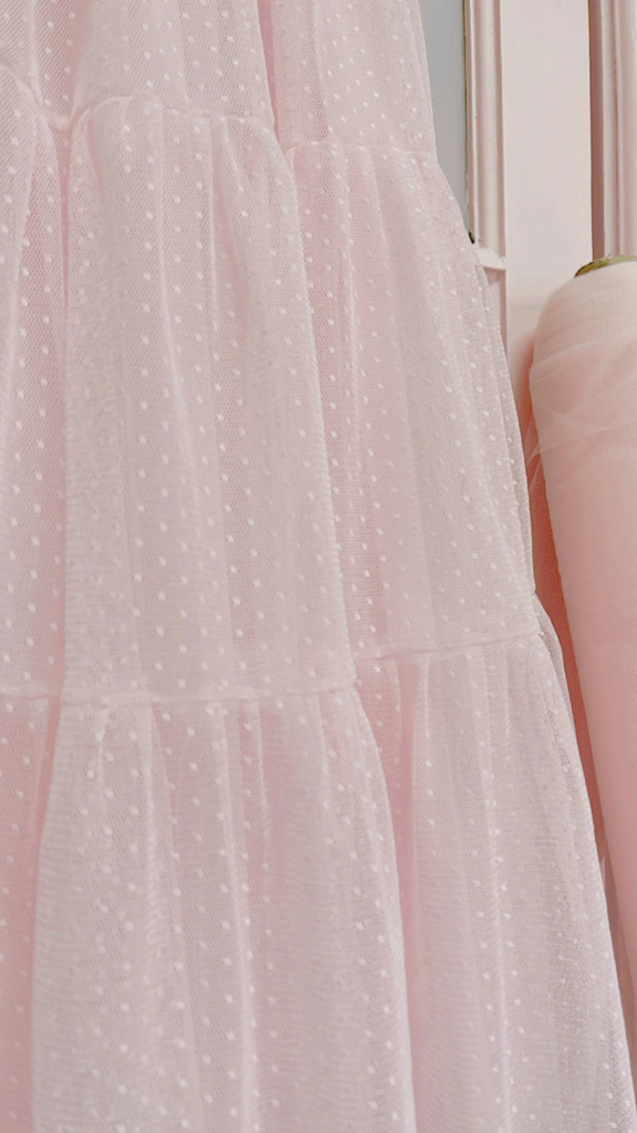 VESTIDO DE TULLE ROSA O NEGRO CON ESCOTE EN V, MANGAS GLOBO CON ELASTICO EN LOS PUÑOS Y FALDA DE RECORTES Y VOLADOS EN LARGO MIDI